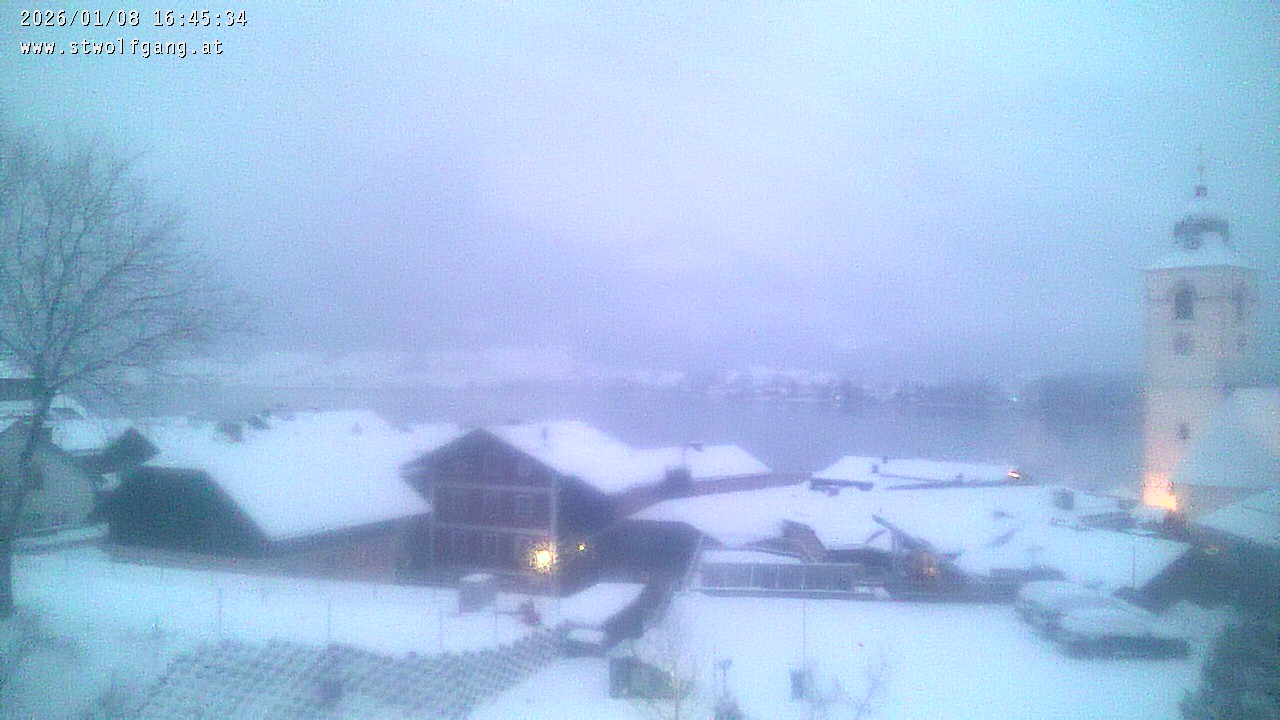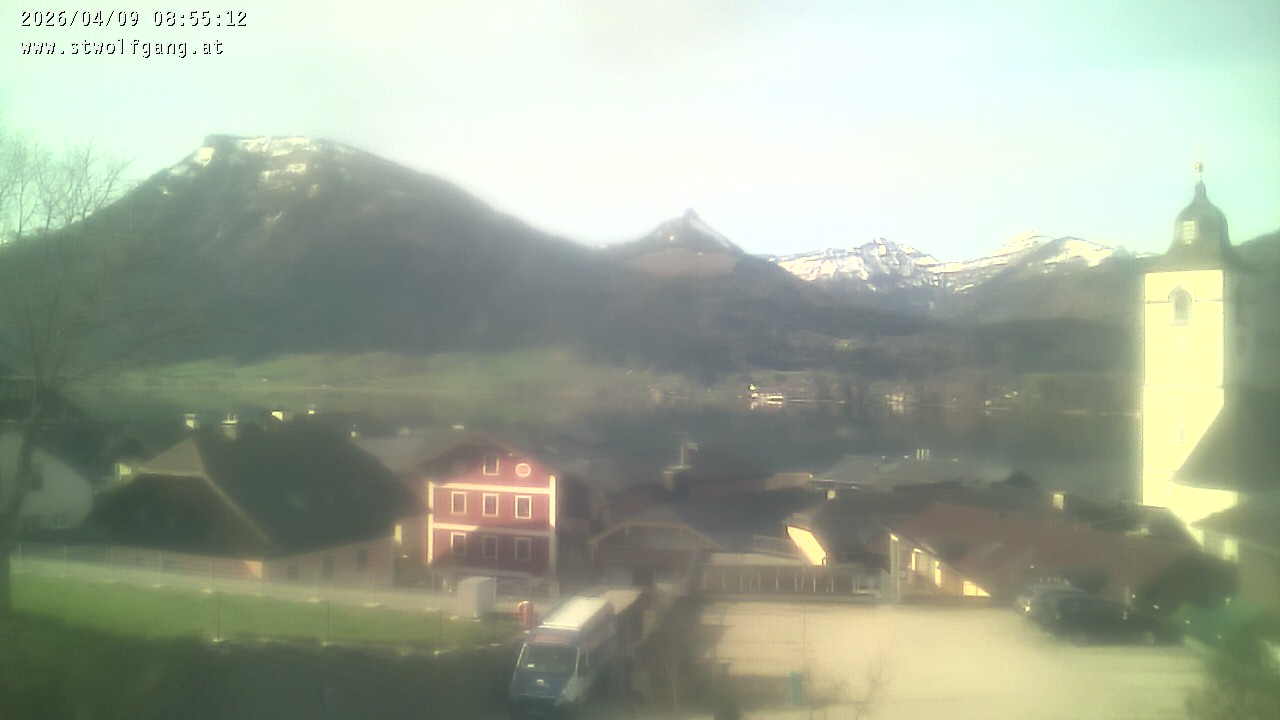 Here you see the current live image from the webcam of the guest house Menkens in St. Wolfgang. This is a perfect view over the roofs of St. Wolfgang, as well as the church and the clear Wolfgangsee.